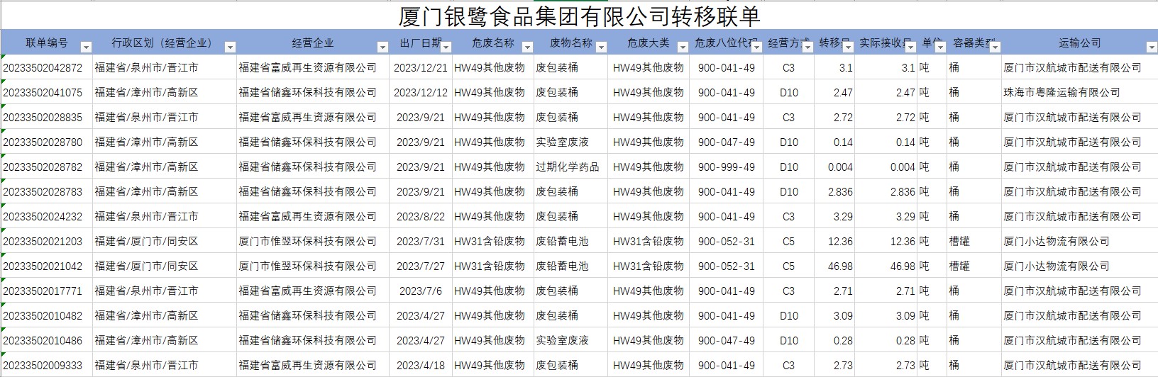 廈門基地危廢2023年度去向